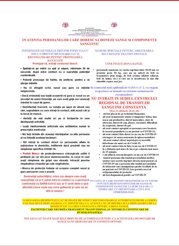 NU INTRATI ÎN SEDIUL CENTRULUI REGIONAL DE TRANSFUZII SANGUINE CONSTANȚA