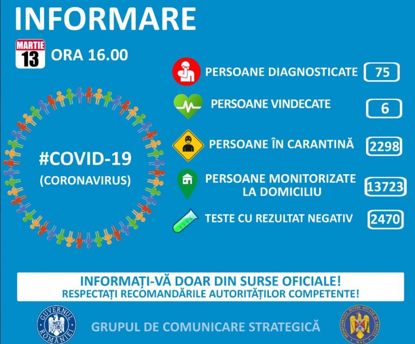 Până la acestă dată, la nivel național, au fost prelucrate 2.545 de teste. Dintre acestea, 2.470 au fost cu rezultat negativ, adică persoanele de la care au fost prelevate mostrele analizate nu sunt infectate cu COVID-19.