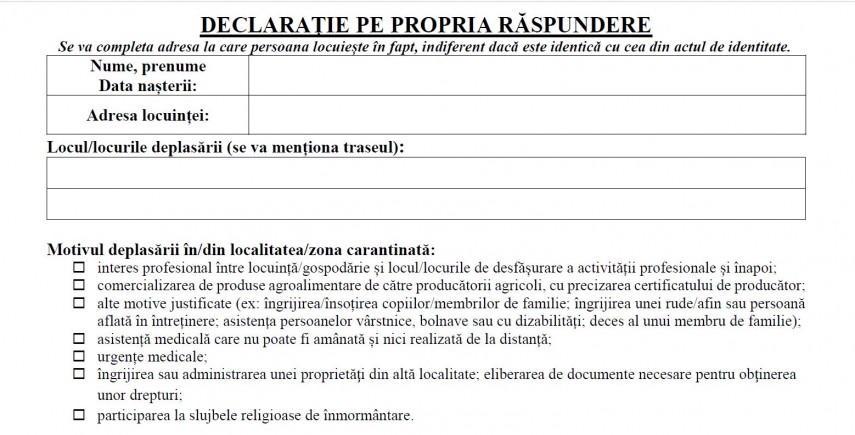 - Declarația poate fi tipizată sau redactată de mana cu respectarea tuturor câmpurilor obligatorii din declarația tip (numele și prenumele, data nașterii, adresa locuinței/gospodăriei/locului activității profesionale, motivul deplasării, data completării)