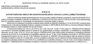 - Ordinul de carantinare pentru Lumina a fost semnat de șeful DSU, astfel că, măsura de carantină zonală a fost prelungită începând cu data de 21.04.2021, ora 20:00, pentru o perioadă de 3 zile, până în data de 24.04.2021, ora 20:00.