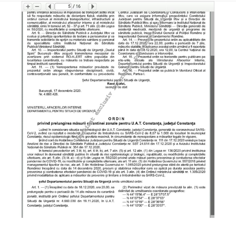 Luând în considerare situația epidemiologică din UAT Constanța, județul Constanța, generată de COVID-19, Raed Arafat a emis următorul ordin: