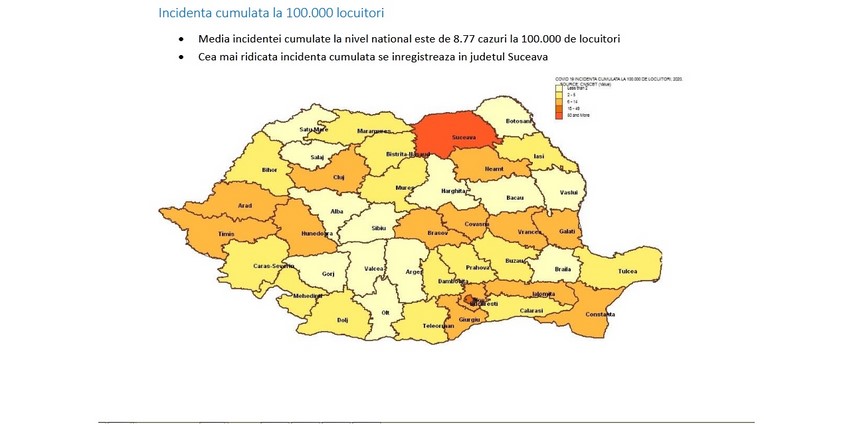 Primul caz a fost confirmat în România cu noul Coronavirus la data de 26 februarie, în următoarele zile fiind confirmate câte 1-2 cazuri zilnic, se arată în documentul oficial. Totuși, lucrurile au luat o altă turnură începând cu data de 10 martie: „Din 10 martie, trendul devine ascendent, media cazurilor urcând până la 30, dublându-se apoi la fiecare trei zile“, potrivit CNSCBT.Media incidenței cumulate la nivel național este de 8,77 cazuri la 100.000 de locuitori, iar cea mai ridicată incidență cumulată se înregistrează în județul Suceava, se arată în studiu.