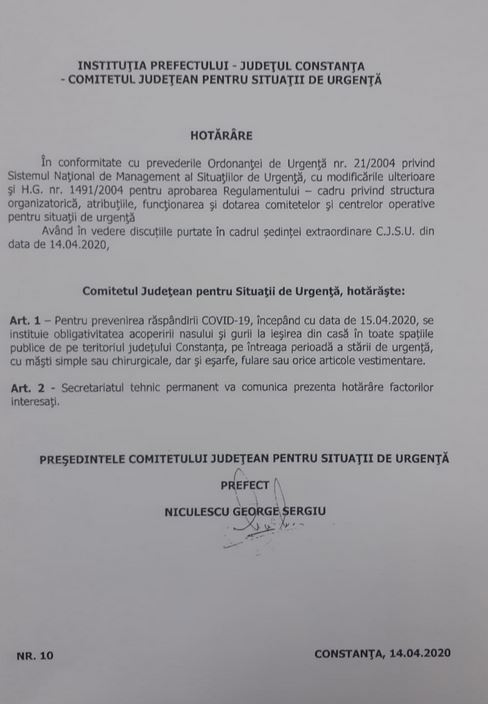 Purtarea măștii devine obligatorie în județul Constanța, pe întreaga perioadă a stării de urgență! (document)