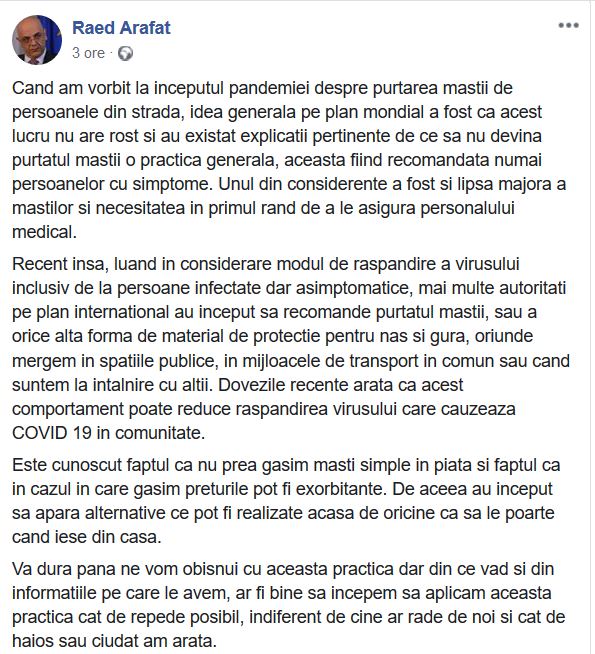 Nu uitati ca numai impreuna putem invinge acest virus, a postat Raed Arafat pe pagina sa de Facebook.