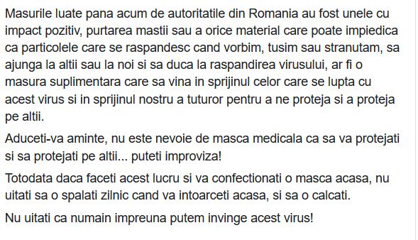 Masurile luate pana acum de autoritatile din Romania au fost unele cu impact pozitiv, purtarea mastii sau a orice material care poate impiedica ca particolele care se raspandesc cand vorbim, tusim sau stranutam, sa ajunga la altii sau la noi si sa duca la raspandirea virusului, ar fi o masura suplimentara care sa vina in sprijinul celor care se lupta cu acest virus si in sprijinul nostru a tuturor pentru a ne proteja si a proteja pe altii.