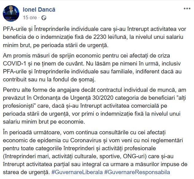 Prin intermediul unei postări pe Facebook, Ionel Dancă, șeful Cancelariei premierului, a vorbit despre PFA-urile și întreprinderile individuale care și-au întrerupt activitatea.