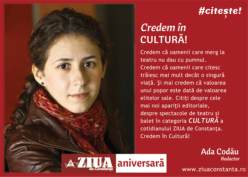 Credem că oamenii care merg la teatru nu dau cu pumnul. Credem că oamenii care citesc trăiesc mai mult decât o singură viaţă. Şi mai credem că valoarea unui popor este dată de valoarea elitelor sale. Citiţi despre cele mai noi apariţii editoriale, despre spectacole de teatru şi balet în categoria CULTURĂ a cotidianului ZIUA de Constanţa. Credem în Cultură!Ada Codău