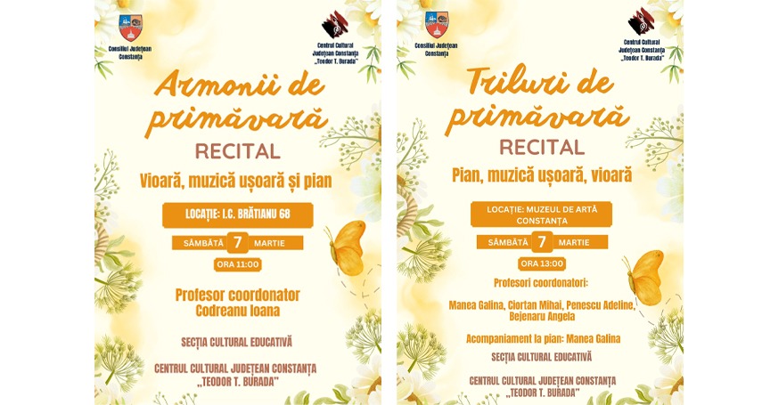 Centrul Cultural Județean „Teodor T. Burada” Constanța anunță două recitaluri ce vor fi susținute de elevii Secției Cultural Educative, sâmbătă, 7 martie 2026.