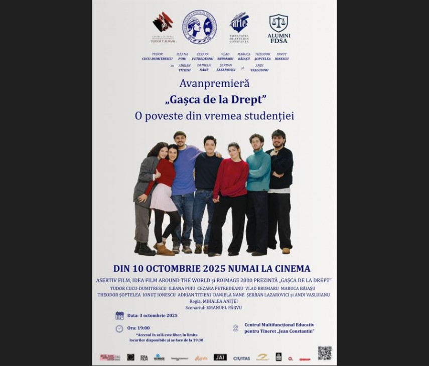Centrul Cultural Județean „Teodor T. Burada”, în parteneriat cu Universitatea Ovidius din Constanța, găzduiește avanpremiera filmului ,,Gașca de la Drept”, o producție românească inspirată din cartea profesorului universitar Mihai Adrian Hotca - ,,Gașca de la Drept. O poveste din vremea studenției.”