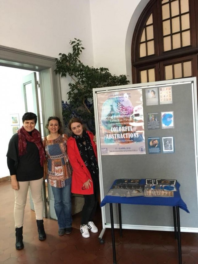 „În cadrul mobilității Erasmus+ pe anul universitar 2017-2018, am realizat la Institutul Politehnic din Lisabona, Portugalia, un workshop de pictură tradițională românească pe sticlă. Scopul acestei activități a fost prezentarea acestei tehnici specifice spațiului românesc studenților din cadrul instituției partenere, de la specializarea Pedagogia Artelor Vizuale. Activitatea în cadrul Institutului Politehnic din Lisabona a fost coordonată de prof. dr. Teresa Pereira, din partea Facultății de Științe ale Educației, specializarea Arte Vizuale. După ce am prezentat pe scurt tehnica picturii pe sticlă și am arătat imaginii sugestive, studenții au început să lucreze, fiecare realizând propriile compoziții. S-au arătat interesați de activitatea propusă, în special datorită faptului că a fost vorba despre o tehnică nouă pentru ei. Consider că alegerea acestui subiect a fost una fericită, cei prezenți lucrând cu pasiune și pricepere, iar lucrarea finală a fost una reușită. Un alt aspect al vizitei noastre în cadrul instituției partenere din Lisabona a fost prezentarea expoziției «Colorful Abstractions», prin această activitate promovând arta și cultura românească în afara granițelor țării“, a spus și lect. univ. dr. Sânziana Romanescu.