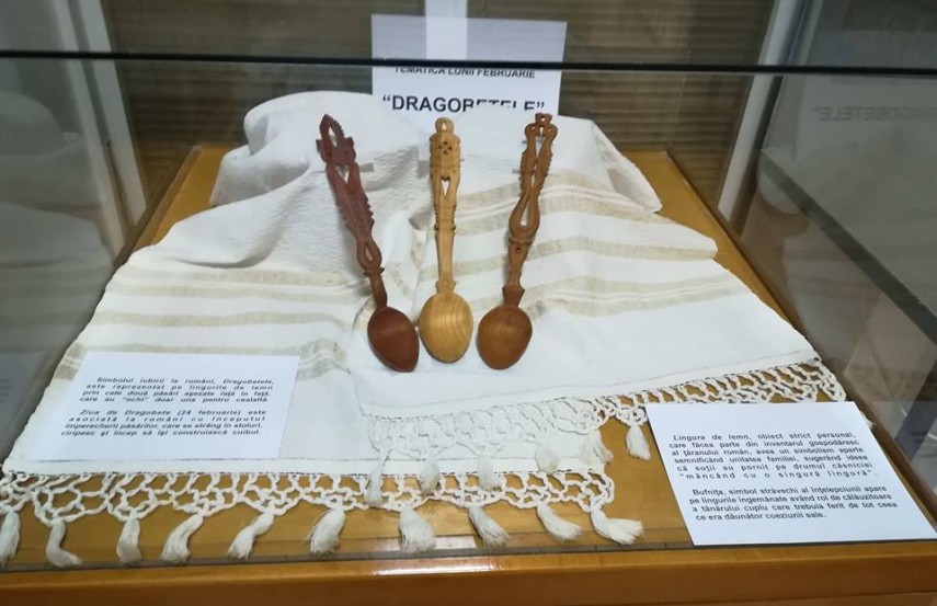 Tematica lunii februarie este Dragobetele, divinitate din panteonul românesc, protector al îndrăgostiților, sărbătorit în fiecare an la 24 februarie. Dragobetele este reprezentat pe linguri de lemn pe ale căror cozi cioplite se regăsesc vechi simboluri românești: două păsări așezate față în față, care „au ochi” doar una pentru cealaltă, semnificând cuplul de îndrăgostiți. Pe unele linguri este reprezentată o bufniță, simbol al înțelepciunii, iar pe altele apare, deasupra celor două păsări, un simbol solar, care semnifică divinitatea ce protejează tânăra pereche.