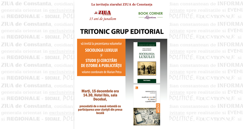 Profesorul universitar Marian Petcu, de la Catedra de Antropologie Culturală şi Comunicare a Universităţii din Bucureşti, se va afla marţi, 15 decembrie, la Constanţa, pentru a lansa volumele „Sociologia luxului“ şi „Studii şi cercetări de istorie a publicităţii“, ambele coordonate de el şi apărute în colecţia Comunicare media a Editurii Tritonic. La eveniment va participa şi Bogdan Hrib, directorul editurii.