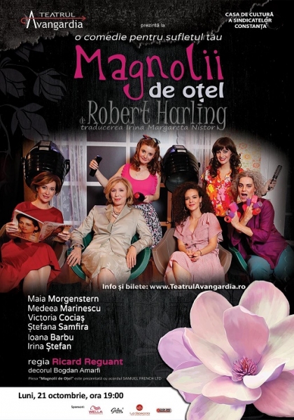 Luni, 21 octombrie, începând cu ora 19, la Casa de Cultură din Constanța, veți putea vedea sau revedea (căci spectacolul a mai fost prezentat la începutul anului în Constanța) comedia „Magnolii de oțel”, montat de Teatrul Avangardia din București.Piesa lui Robert Harling, care s-a bucurat de succes în întreaga lume, îi are ca protagoniști pe Maia Morgenstern, Medeea Marinescu și Victoria Cociaș, fiind o comedie - dramatizată pe alocuri - despre femei și modul în care gestionează ele crizele serioase din cursul vieții, găsind puterea să se ridice și să meargă mai departe, indiferent de suferințele care le marchează existența.