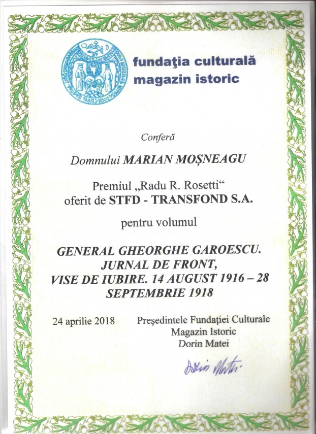 Comandorul (r) dr. Marian Moșneagu a fost distins cu Premiul „Radu R. Rosetti“, oferit de Fundaţia Culturală „Magazin istoric“, pentru publicarea, la Editura Militară, a memoriilor generalului Gheorghe Garoescu, „Jurnal de front, vise de iubire. 14 august 1916 - 28 septembrie 1918“.