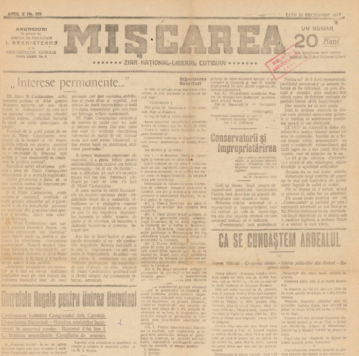 Primul Crăciun al României Mari. Decretele Regale pentru Bucovina, publicate de ziarul Mișcarea pe 24 decembrie