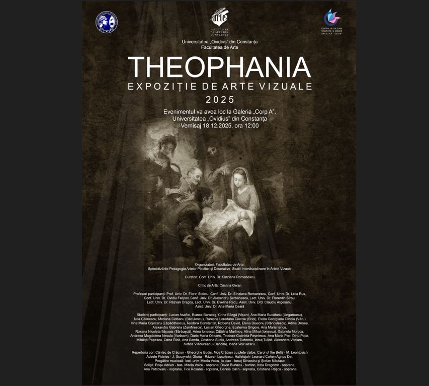 Facultatea de Arte, din cadrul Universității „Ovidius” din Constanța, organizează joi, 18 Decembrie 2025, începând cu ora 12.00, la sediul de pe Aleea Universității, nr. 1, Corp A Campus, vernisajul expoziției „Theophania”, eveniment artistic menit să întâmpine Sfânta Sărbătoare a Nașterii Domnului.