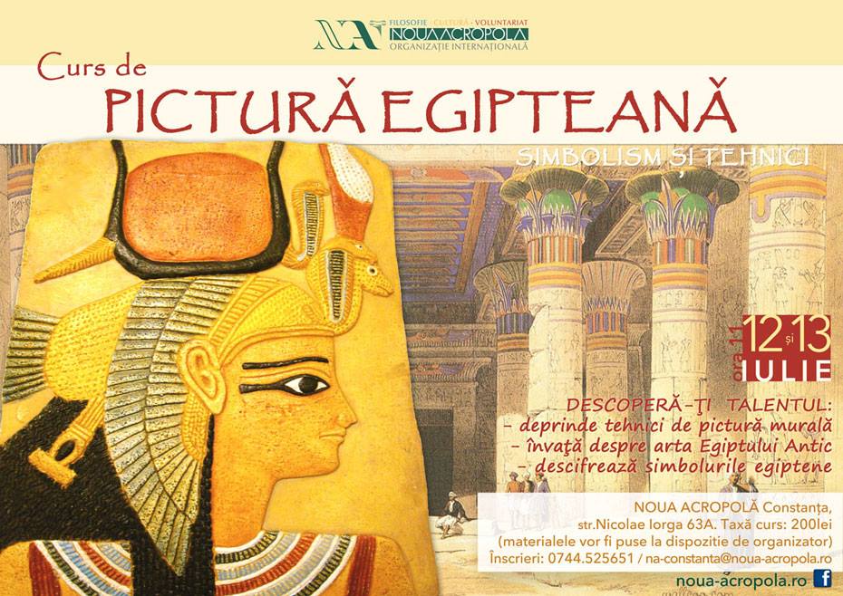 În acest weekend, pe 12 şi 13 iulie, la Constanţa, Asociaţia culturală Noua Acropolă propune o activitate ce stimulează creativitatea, în cadrul unei întâlniri cu una dintre cele mai misterioase civilizaţii ale lumii, şi anume Egiptul Antic.Astfel, pe 12 şi 13 iulie, de la ora 11.00, la sediul Noii Acropole, va avea loc Cursul de Pictură Egipteană „Simbolism şi tehnici”, ce se adresează atât începătorilor, cât şi persoanelor cu experienţă. Prin intermediul acestui curs, participanţii îşi vor însuşi şi dezvolta tehnicile de transpunere la scară a imaginilor, în acelaşi timp, familiarizându-se cu normele şi simbolismul din artă.