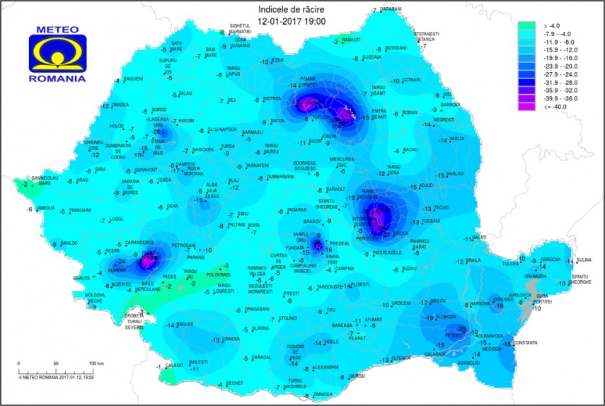 Totodată, indicele de răcire, temperatura resimțită a ajuns astăzi, în aceleași stații meteo la următoarele temperaturi: