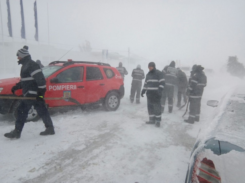 Angajați ai Inspectoratului pentru Situații de Urgență ”Dobrogea” alături de militari de la Brigada 9 Mecanizată ”Mărășești” intervin pentru a scoate din nămeți autoturismele care au pornit la drum ignorând recomandările autorităților de a evita drumurile pe perioada codului de vreme rea.