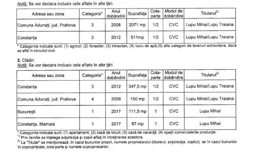 Potrivit documentului, Mihai Lupu deține trei terenuri intravilane în Prahova (2.071 mp), Constanța (511 mp) și Iași (2.536 mp), ultimul dobândit în 2022 prin moștenire.