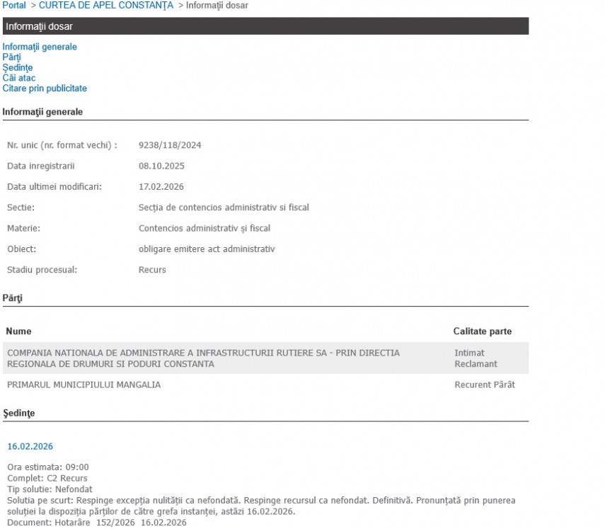 Potrivit motivării de pe ReJust, reclamanta CNAIR SA – DRDP Constanța „a arătat că, deşi prin adresa nr. 46740/06.11.2024 a solicitat Primăriei Municipiului Mangalia emiterea acestei dispoziții şi a transmis spre însușire procesele-verbale de constatare şi identificare a sectoarelor de drum, Primarul Municipiului Mangalia nu a emis actul administrativ necesar. Mai mult, prin notificarea nr. 50660/29.11.2024, comunicată la 03.12.2024, reclamanta a reiterat solicitarea, însă nici în acest termen nu s-a emis dispoziţia.”