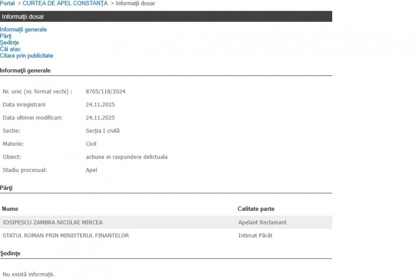 - Dosarul cu indicativul 8765/118/2024 a fost înregistrat prima dată pe 29 noiembrie 2024 la Tribunalul Constanța, cu obiect procesual „acțiuni în răspundere delictuală”