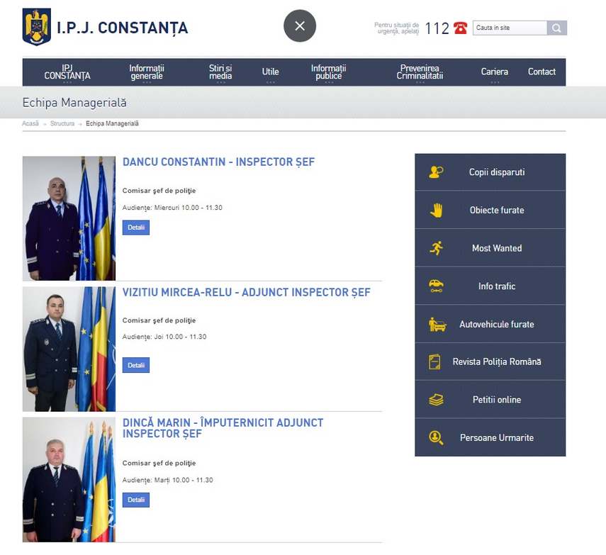 Ca atare, echipa managerială a Poliţiei Judeţului Constanţa este formată din: comisarul-şef de poliţie Constantin Dancu, inspector-şef al IPJ Constanţa, comisarul-şef de poliţie Mircea Relu Vizitiu - adjunct al inspectorului-şef şi comisarul-şef de poliţie Marin Dincă, împuternicit adjunct inspector-şef.