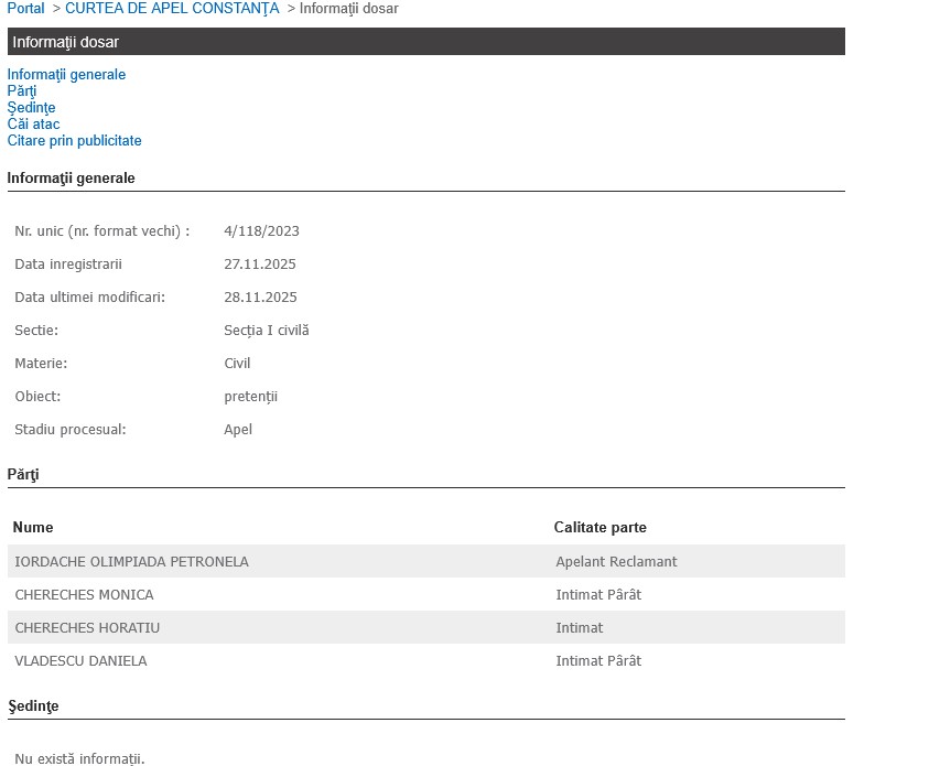 „Solutia pe scurt: DOSAR NR.4/118/2023 HOT. 11.09.2025 Respinge, ca nefondată, cererea formulată de reclamanta IORDACHE OLIMPIADA IORDACHE, în contradictoriu cu pârâţii CHERECHEŞ MONICA, CHERECHES HORAŢIU, VLĂDESCU DANIELA. Cheltuieli pe cale separată. Cu drept de apel în termen de 30 de zile de la comunicare. Cererea de apel se depune la Tribunalul Constanţa, sub sancţiunea nulităţii. Pronunţată prin punerea solu?iei la dispoziţia părţilor prin mijlocirea grefei, astăzi, 11.09.2025.