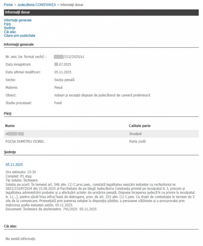 Procesul în care fostul deputat AUR Dumitru Viorel Focșa l-a chemat în judecată pe inculpatul A.I., pentru presupusa faptă de distrugere, ar putea fi demarat! Aceasta a fost decizia Judecătoriei Constanța, care săptămâna anterioară, la data de 05 noiembrie 2025, a validat rechizitoriul întocmit de procurorii de la Parchetul de pe lângă Judecătoria Constanța.