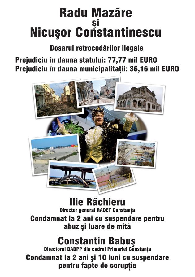 Aceştia amintesc şi de celebrul dosar al retrocedărilor, în care Mazăre este judecat alături de preşedintele Consiliului Judeţean Constanţa, Nicuşor Constantinescu, şi de alte 35 de persoane (angajaţi ai instituţiilor publice, notari, oameni de afaceri). Nu mai puţin important, pe aceleaşi materiale ce urmează să fie împărţite, vineri, participanţilor la protest, e reamintit cazul lui Ilie Rachieru, fostul director general al RADET, condamnat la doi ani de închisoare cu suspendare pentru abuz în serviciu contra intereselor publice în formă calificată, pentru abuz în serviciu contra intereselor persoanelor şi pentru luare de mită în formă continuată.