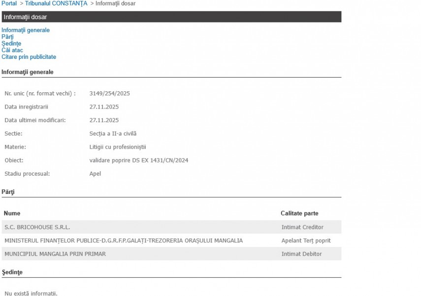 - Dosarul cu indicativul 3149/254/2025 a fost înregistrat pe 27 noiembrie a.c., în urma căii de atac formulate de Trezoreria Mangalia
