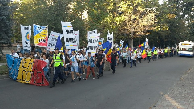 De asemenea, manifestanţii au scandat „Unire“, „Basarabia e România“ şi „Trăiască, trăiască, să-nflorească Moldova, Ardealul şi Ţara Românească!“.