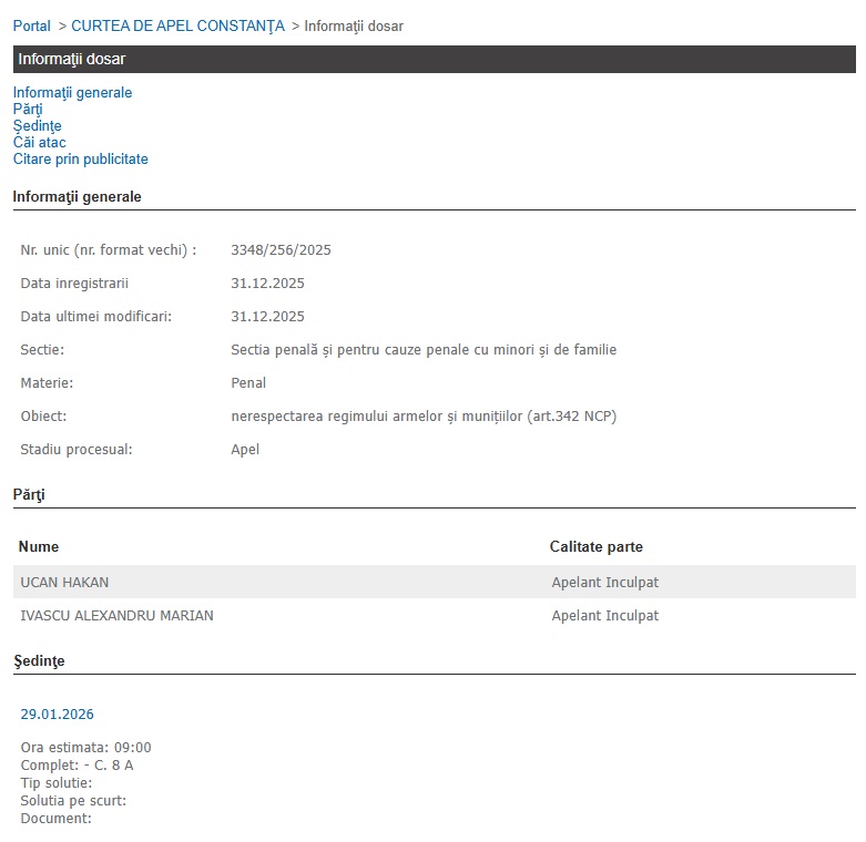 La data de 26 noiembre 2025, Judecătoria Medgidia l-a condamnat pe Ucan Hakan la 2 ani și 3 luni de închisoare, în regim de detenție și i-a confiscat pistoalele.