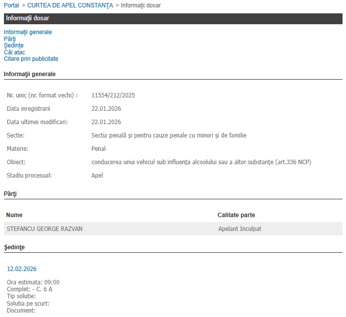 Drept urmare, în data de 19.12.2025, Judecătoria Constanța l-a condamnat pe Ștefancu George Răzvan la 3 ani de închisoare, cu suspendare, sub termen de supraveghere de 4 ani.
