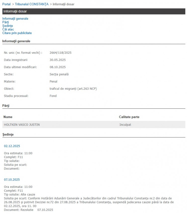 Primul termen de judecată de la Tribunalul Constanța a fost programat pentru data de 07.10.2025, însă judecarea cauzei a fost suspendată, urmând ca la începutul lunii decembrie să aibă loc un termen nou.