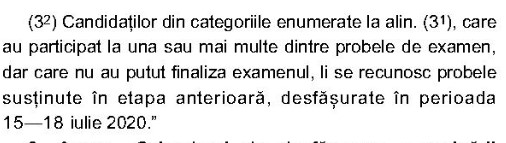 La art. 1 (3) se precizează faptul că elevilor care au participat la una din probele din prima sesiune, dar care nu au putut finaliza examenul din motive medicale, li se recunosc probele susținute în etapa anterioară.
