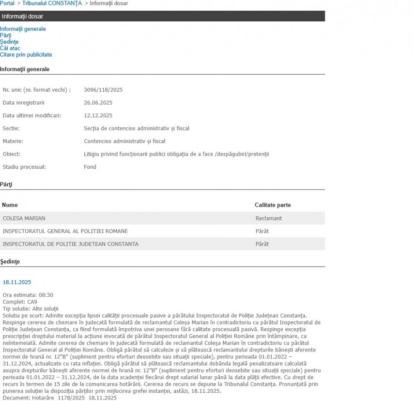- Polițistul Marian Coleșa a dat în judecată Inspectoratul General al Poliției Române și Inspectoratul de Poliție Județean Constanța solicitând să-i fie acordate drepturile bănești pentru suplimentul 12B la norma de hrană în perioada 01.01.2022 – 31.12.2024, actualizate cu rata inflației, împreună cu dobânzile legale aferente perioadei în care drepturile au fost acordate, de la scadența acestora