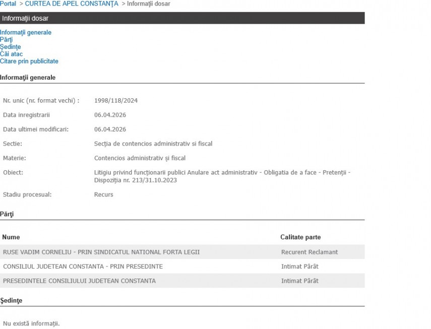 „Solutia pe scurt: Respinge ca nefondată cererea de chemare în judecată formulată de reclamantul Ruse Vadim-Corneliu prin Sindicatul National „Forta Legii” în contradictoriu cu pârâţii Consiliul Judeţean Constanţa şi Preşedintele Consiliului Judeţean Constanţa. Cu recurs în termen de 15 zile de la comunicare, ce se va depune la Tribunalul Constanţa – Secţia de contencios administrativ şi fiscal. Pronunţată astăzi, 19.02.2026, prin punerea soluţiei la dispoziţia părţilor prin mijlocirea instanţei.