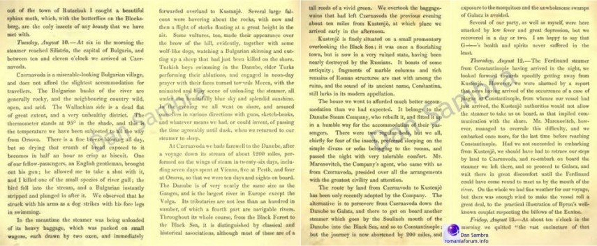 La Cernavodă ne-am despărţit de Dunăre, după un voiaj spre aval de aproximativ 1.200 de mile, realizat pe «aripi de aburi» (se referă aici la vapoarele cu aburi DDSG) în 26 de zile, inclusiv şapte zile petrecute la Pesth, patru la Orşova, astfel încât am fost zece zile şi nopţi la bord.