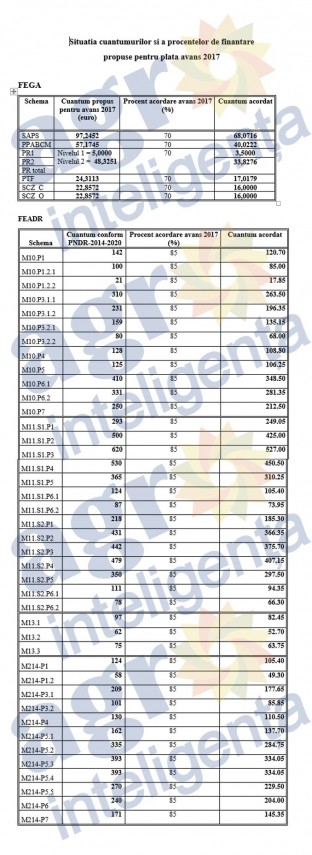 Vă reamintim că de astăzi, luni – 16 octombrie, APIA a demarat plata avansului din subvenția APIA pe 2017. Se acordă 70% din valoarea schemelor de plăți directe și 85% din plățile pentru măsurile compensatorii, cuantumurile ce se virează fermierilor fiind cele din tabelul de mai jos.