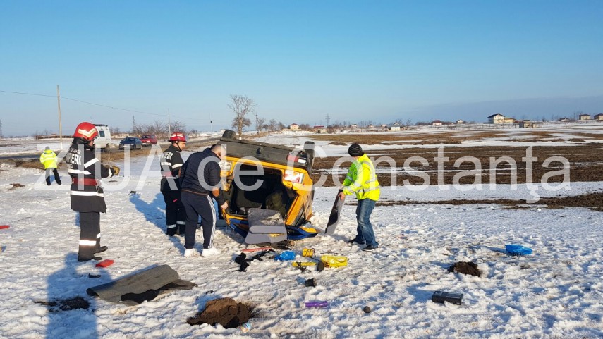 La fața locului sunt și pompierii militari din cadrul ISU „Dobrogea”. Conform primelor date, în mașina răsturnată sunt două persoane, dintre care una a fost transportată la spital.