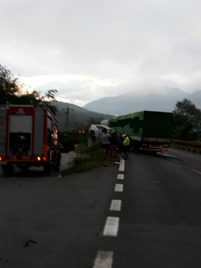 Un autoturism a intrat în coliziune cu un tir. S-a intervenit cu o autospecială de stingere cu modul de descarcerare, o ambulanță SMURD și o ambulanță SAJ.