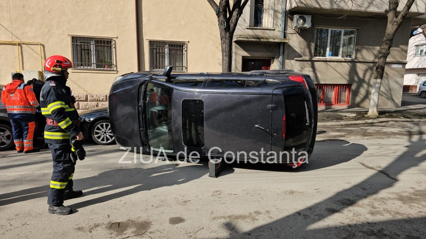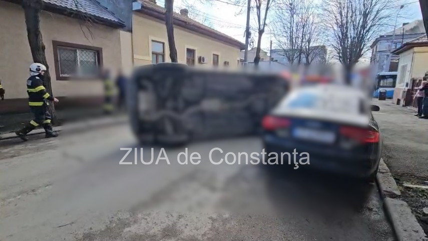 FOTO+VIDEO UPDATE. Autoturism răsturnat în Constanța, la intersecția străzilor Dacia și Mihai Viteazu