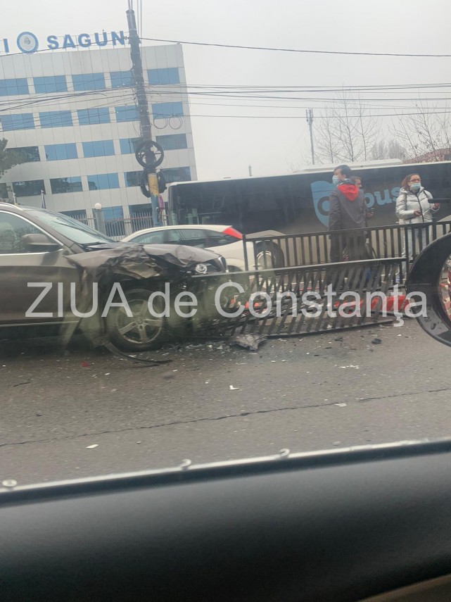 Constanța: Accident rutier în zona Universității Șaguna. Două mașini avariate, una înfiptă în scuar