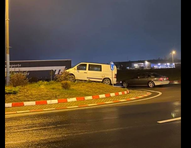 Acolo, un șofer, din cine știe ce cauze, s-a cocoțat, cu duba, pe sensul giratoriu,
