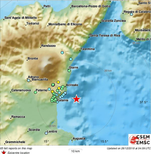 Seismul de intensitate VI a avut loc la coordonatele 37.52 N ; 15.26 E, la 192 km N of Valletta, Malta (pop: 6,800 / local time: 03:19), 180 km E of Palermo, Italia pop: 673,000 / local time: 03:19) 15 km E de Catania (pop: 314,000) şi 10 km SE de Acitrezza, Italia (pop: 5,000).