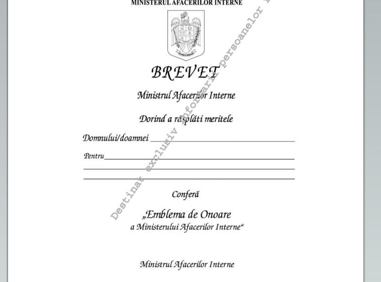 Distincţii onorifice noi în Ministerul Afacerilor Interne. Au fost instituite prin ordin al ministrului Carmen