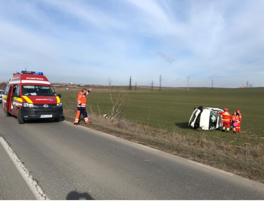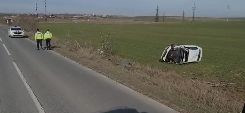 Eveniment rutier cu victimă încarcerată la ieșire din Medgidia. O mașină s-a răsturnat (galerie foto)