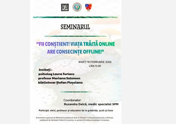 Direcția de Sănătate Publică Constanța, prin Compartimentul de Evaluare și Promovare a Sănătății, în parteneriat cu Biblioteca Județeană Constanța, organizează evenimentul de promovare a sănătății mintale „Fii constient!Viața trăită online are consecințe offline!”.