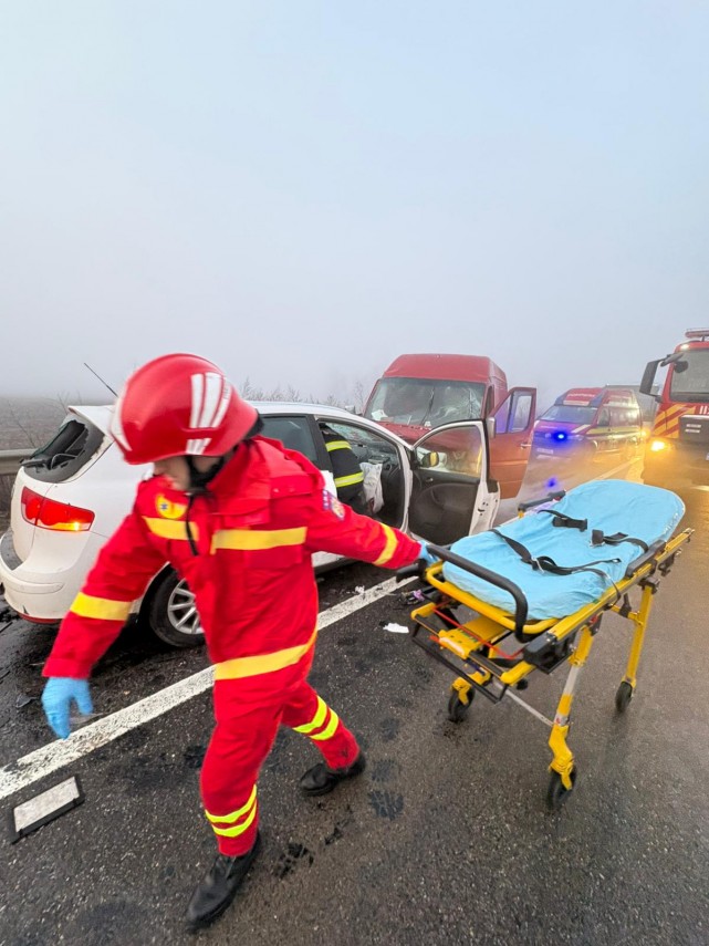 FOTO O autoutilitară și trei autoturisme în care se aflau cinci persoane, dintre care un copil, implicate într-un accident, pe DJ 157